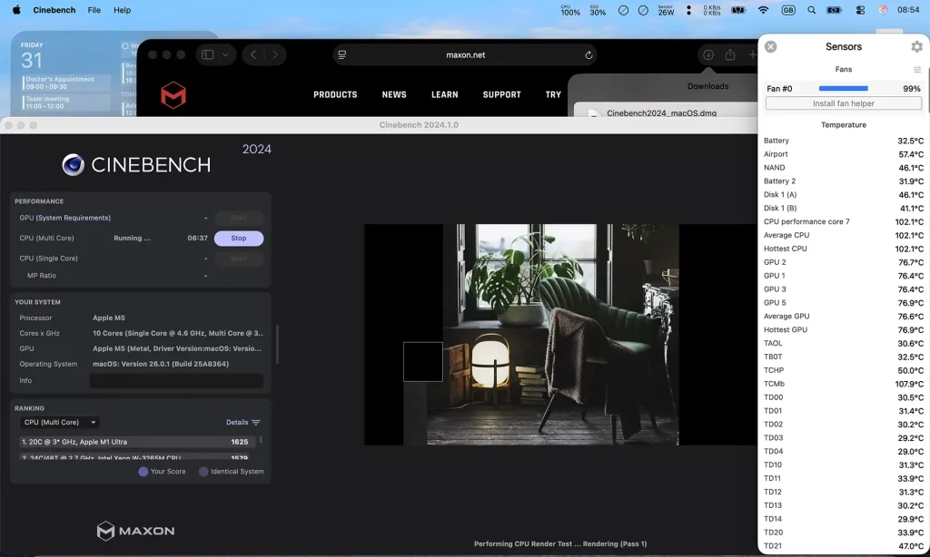 Slična situacija je i u Cinema 4D renederingu, gde posebno ističemo činjenicu da iako prikazana temperatura deluje izuzetno visoko na samoj površini procesorskog jezgra, a što je delom i posledica činjenice da verzija Macbook Pro računara sa običnim M5 primerkom koristi rashladni sistem sa jednim hladnjakom i pripadajućim ventilatorom, za razliku od M4 Pro verzije koja ima napredniji sistem sa dva ventilatora i dva hladnjaka koji su međusobno povezani sistemom toplotnih cevi. Uprkos tome površina računara koju dodirujte skoro da ne prelazi 40 stepeni Celzijusa, a u zoni touchpad-a je još hladnija.